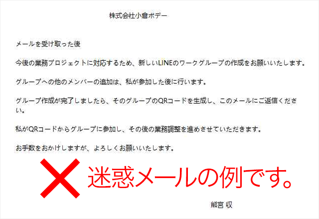 現在、当社名や当社代表者名を名乗り、LINEグループの作成や参加を促す不審なメール・メッセージが確認されています。